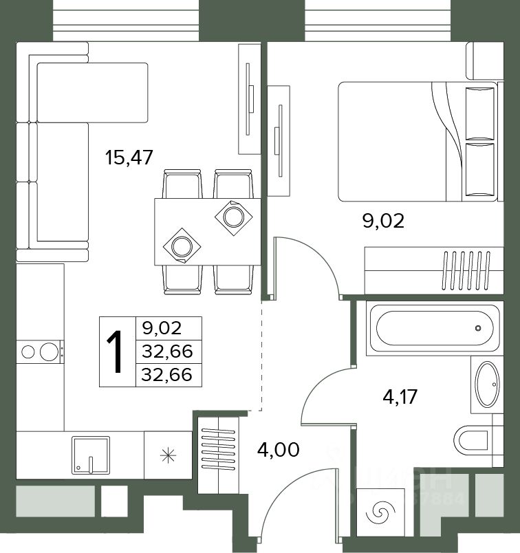 Общая площадь32,66 м2