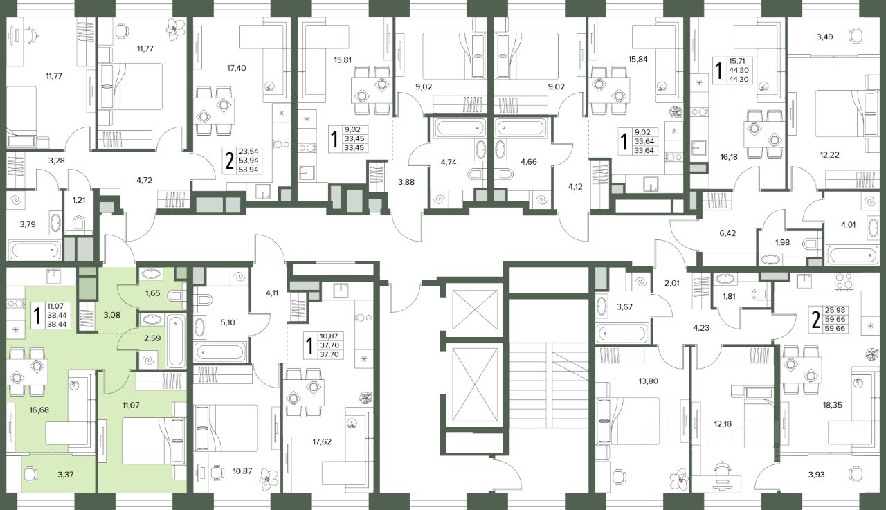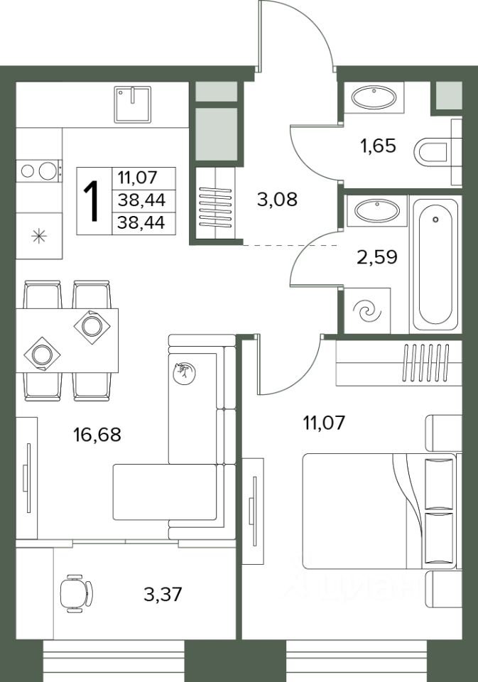 Общая площадь38,44 м2
