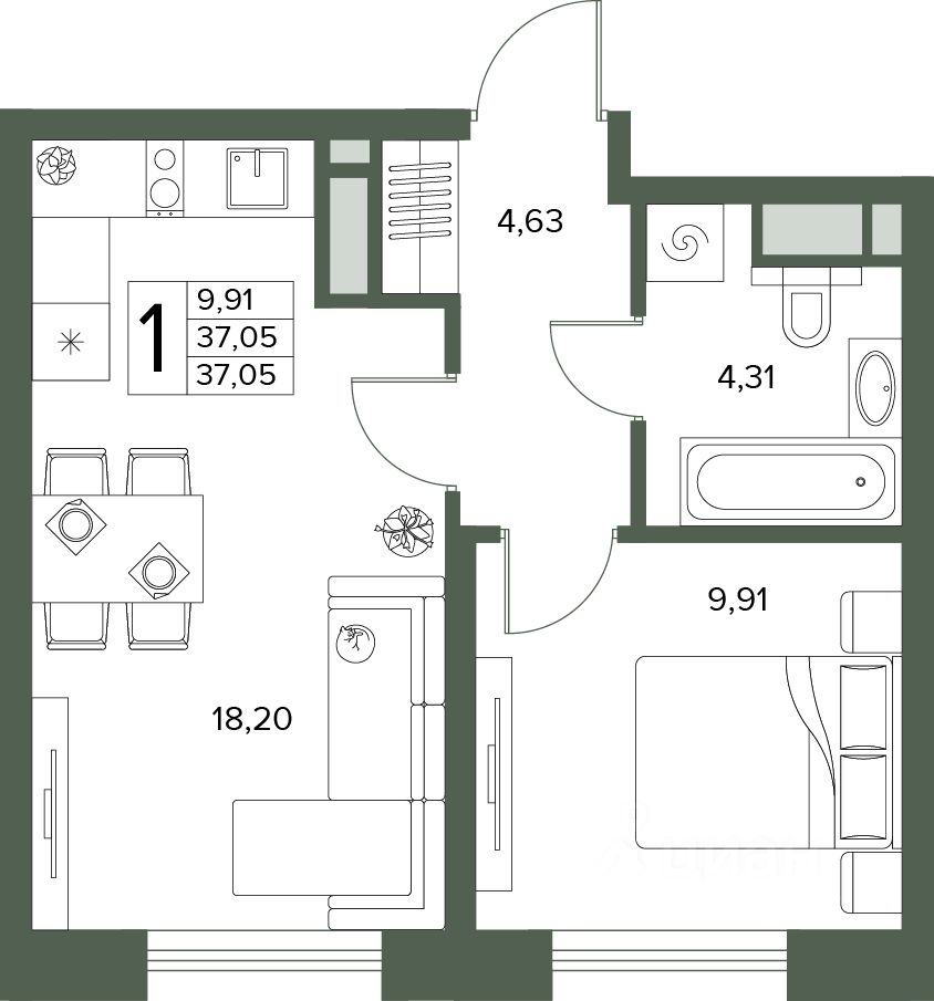 Общая площадь37,05 м2